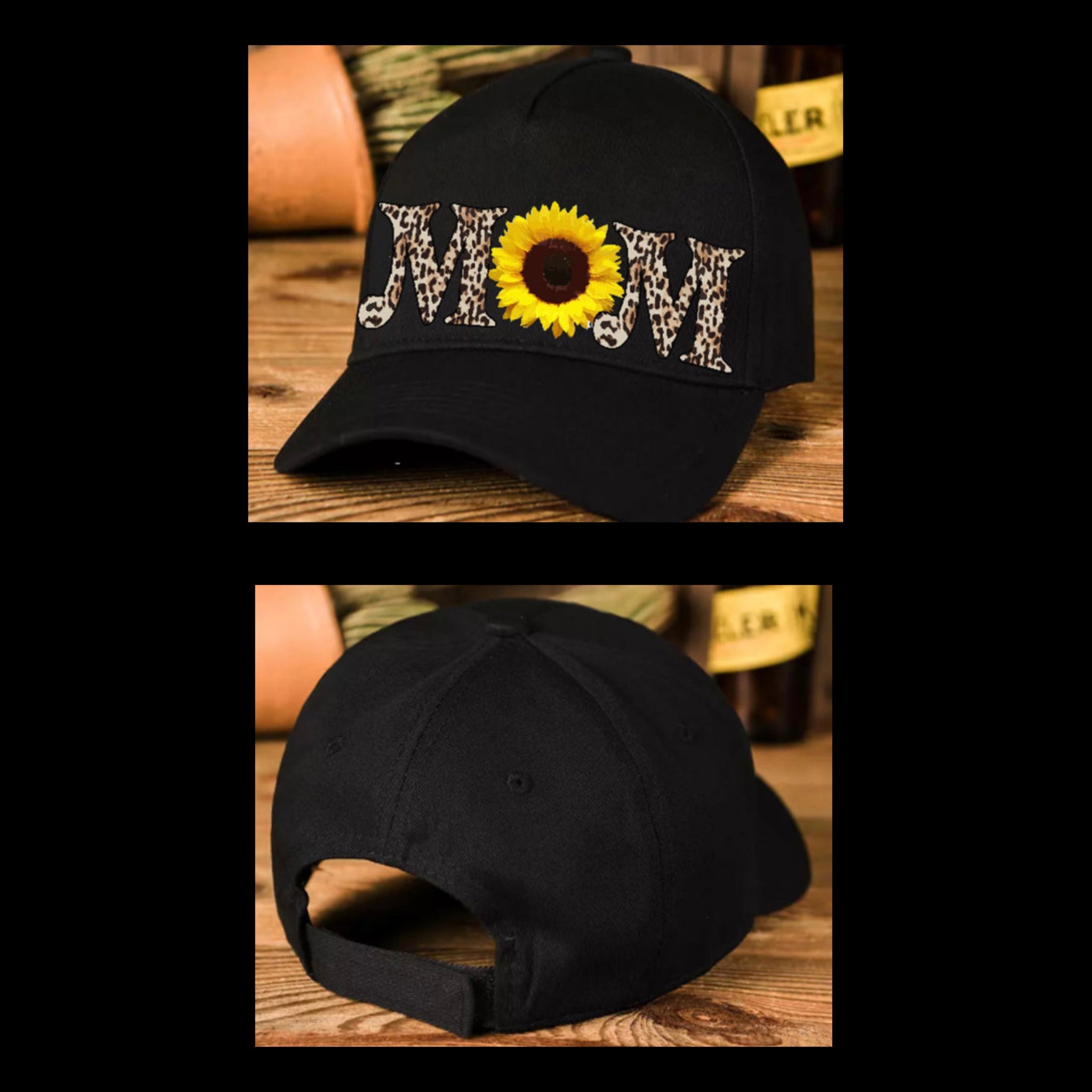2) “Mom” Sunflower Leopard Print Black Baseball Cap