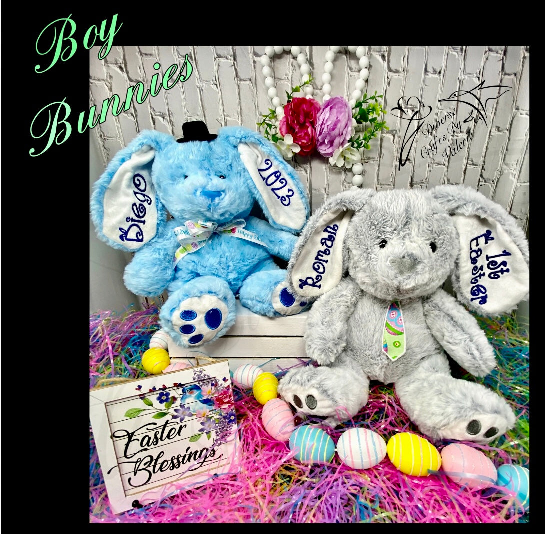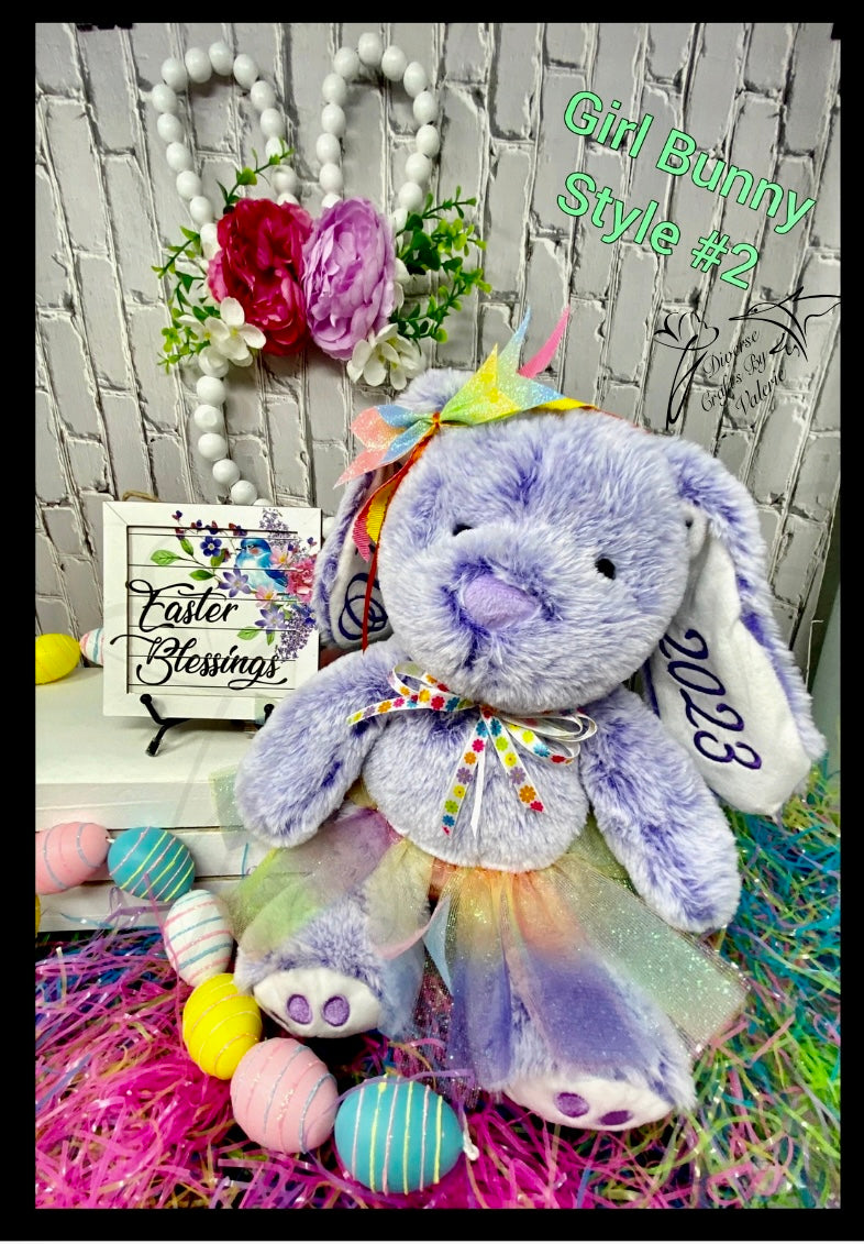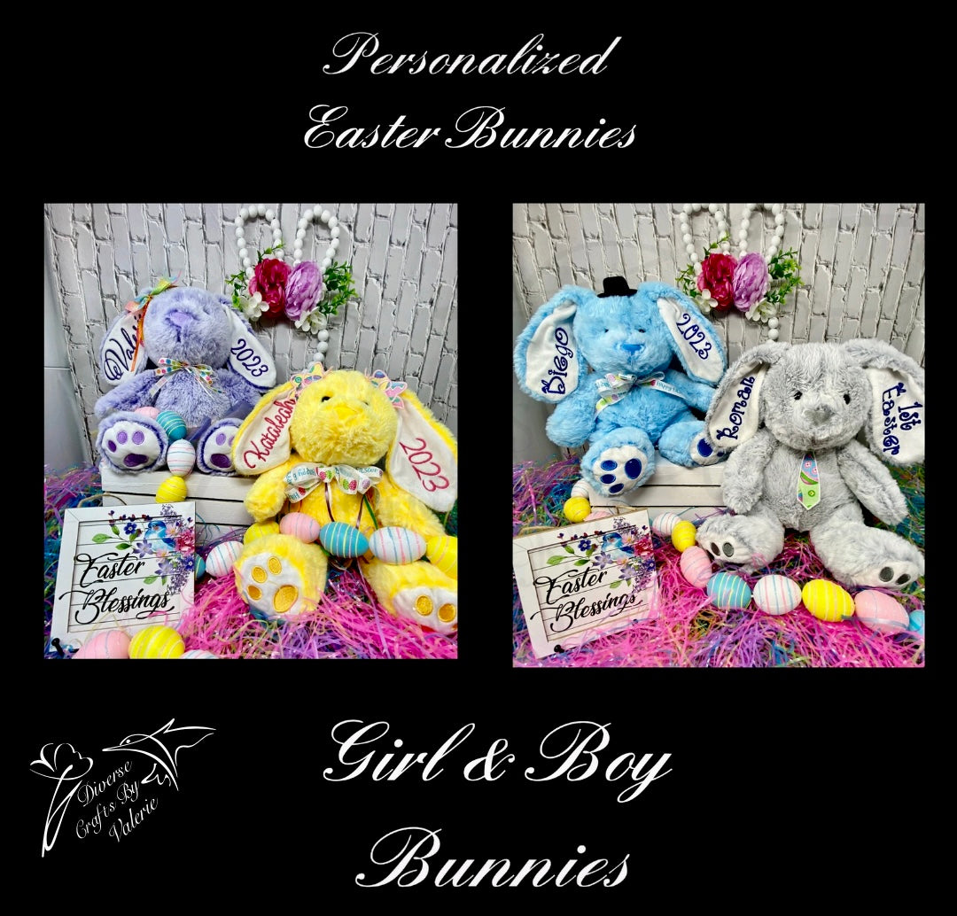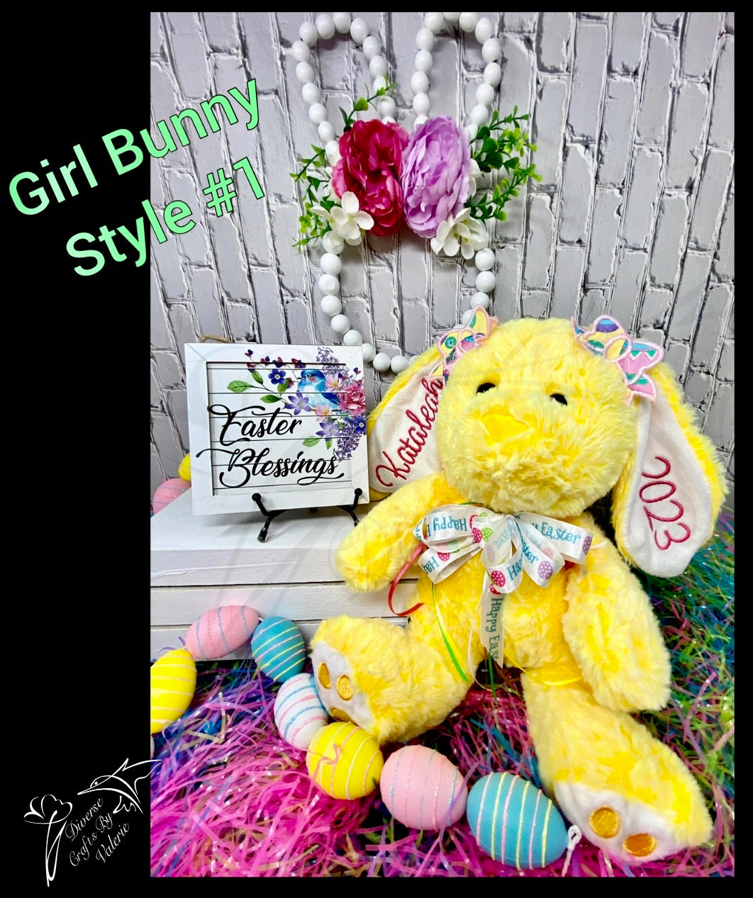 Includes: Personalized Basket, Personalized 10”Plush Bunny( both ears) , Personalized Treat Bag, Bunny Rainbow Easter Grass, Bunny Glasses, Bunny Ears ( pink or blue) & Peek A Boo treat bag ( cat, dog, owl or bunny)