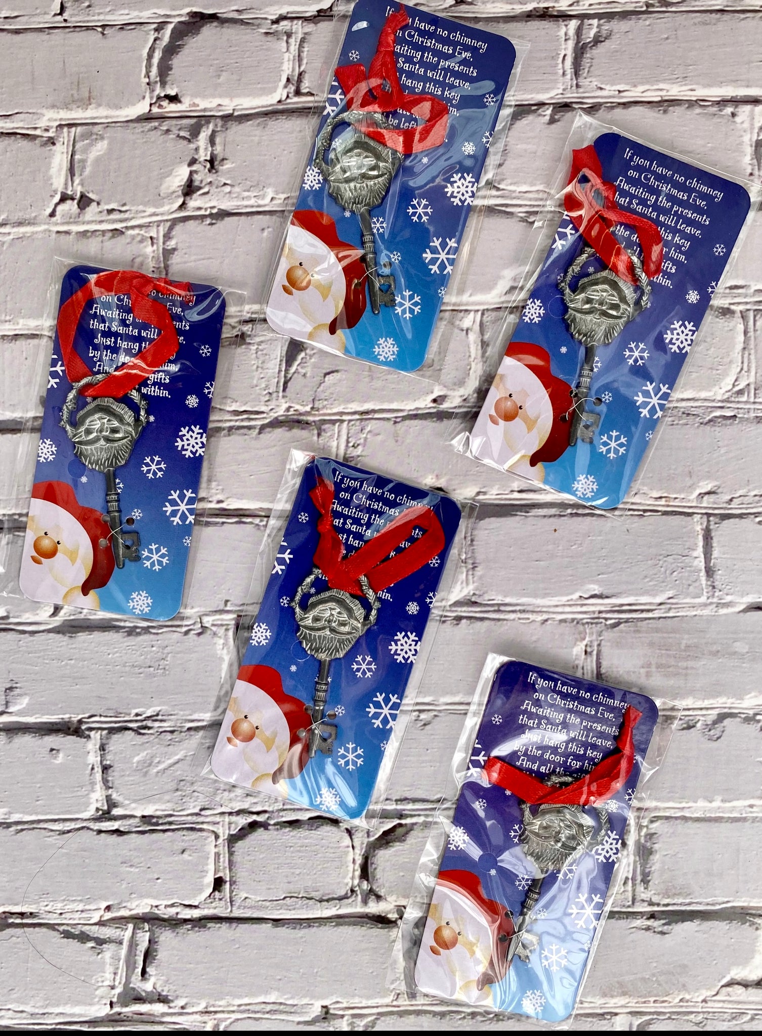 Make sure Santa finds everyone on your list — with or without a chimney. Each metal key arrives with a red ribbon for hanging and its own greeting card. Unlock your child's imagination during the holiday season with a special key for Santa! Each pewtertone metal key with red satin ribbon is on a 4" printed card. Verse on card reads: "If you have no chimney on Christmas Eve, awaiting the presents that Santa will leave, Just hang this key by the door for him, And all the gifts will be left within."